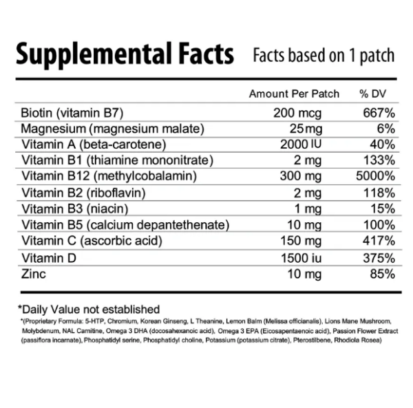 Formulated with a comprehensive blend of natural ingredients to maintain calm focus, boost memory, enhance task completion, support brain health & function. This topical patch is a non-stimulant.*
